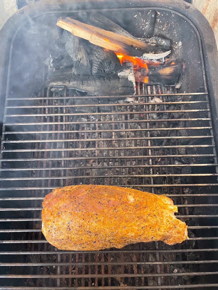 - Le jour même, saupoudrez le ou les jarrets de porc de rub (ou là dinde) et fumez-les à 130°C en cuisson indirecte au BBQ bien entendu. 1 ou 2 heures de fumage suffisent. Le but n’est pas de cuire totalement la viande, mais surtout de la fumer légèrement pour qu’elle puisse parfumer le bouillon.