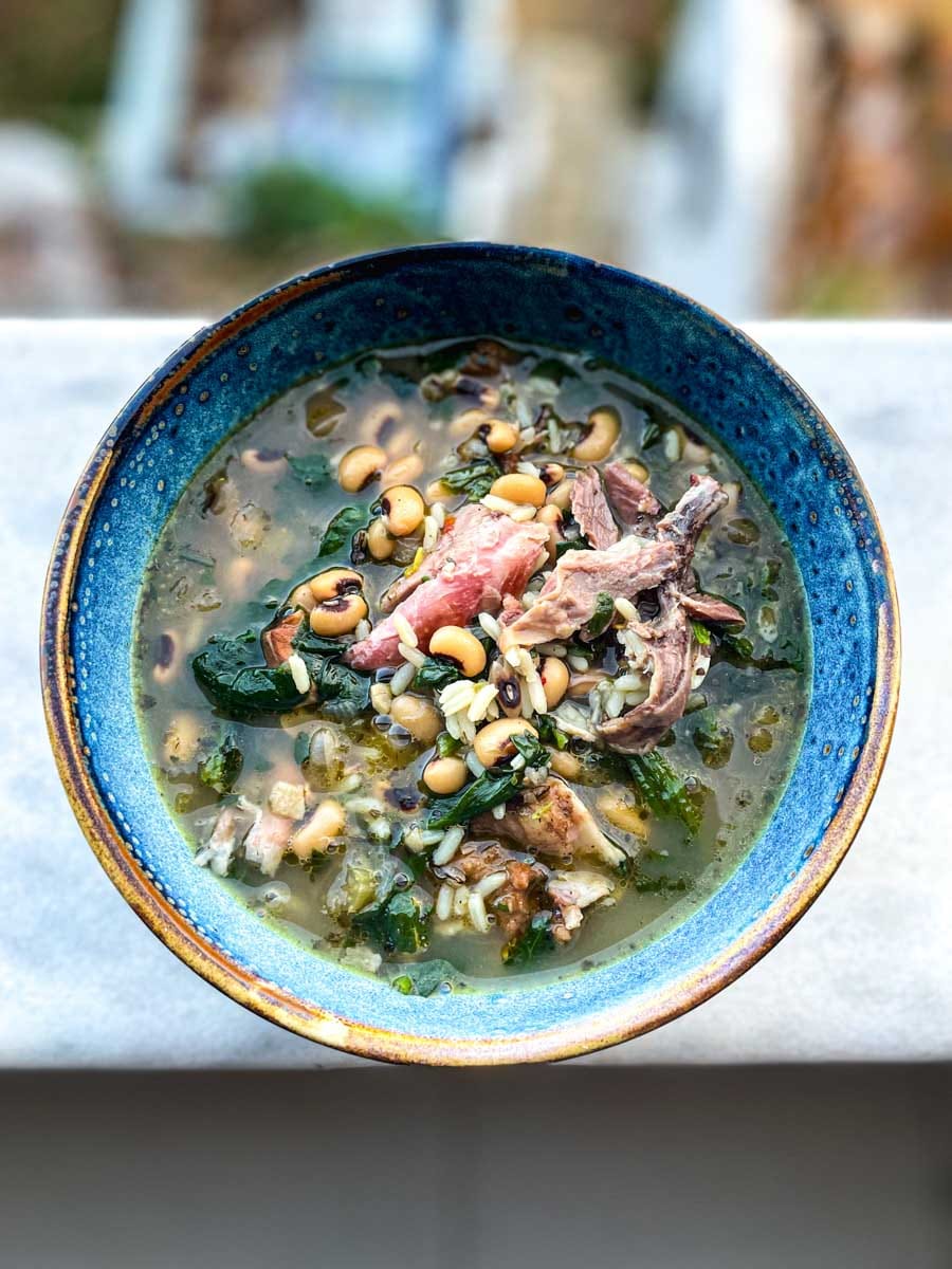 La soupe de Black Eyed Peas aux jarrets de porc fumés est une recette emblématique du Sud américain, revisitée ici en version BBQ fumée au feu de bois. Les black eyed peas (pois à œil noir) apportent une texture crémeuse et une richesse en fibres remarquable, tandis que le jarret fumé diffuse des arômes profonds dans le bouillon.